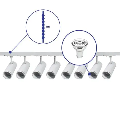Complete Set 1-Phase Rail 3 Meter White | incl. 8x Spot + GU10 2700K 3W Dimmable + End Cap, Power Connector and I-Connector