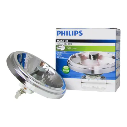 Philips MASTERLine 111 ultra low voltage halogen lamps, with aluminum reflector and double-ended burner and infrared coating. The lamps of Philips Masterline 111 range have many advantages: In addition to being energy efficient, they emit 40% less heat